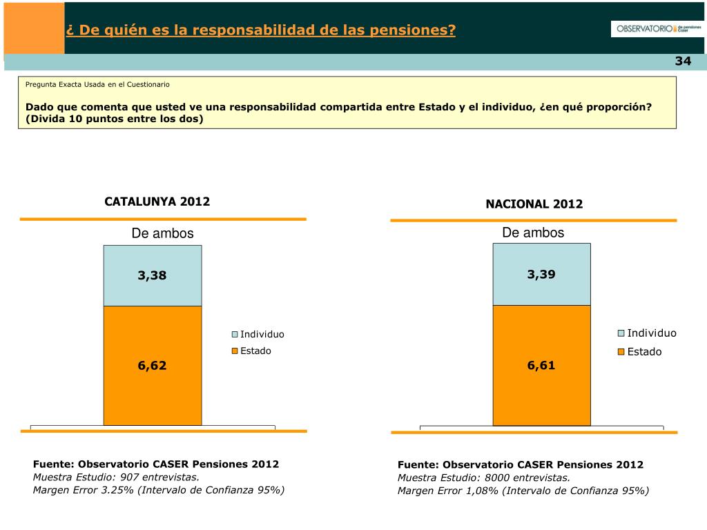 ¿ De quién es la responsabilidad de las pensiones? Pregunta Exacta Usada en el Cuestionario Dado que comenta que usted ve una responsabilidad compartida entre Estado y el individuo, ¿en qué proporción? (Divida 10 puntos entre los dos) CATALUNYA 2012 NACIONAL 2012 De ambos De ambos Fuente: Observatorio CASER Pensiones 2012 Muestra Estudio: 907 entrevistas. Margen Error 3.25% (Intervalo de Confianza 95%) Fuente: Observatorio CASER Pensiones 2012 Muestra Estudio: 8000 entrevistas. Margen Error 1,08% (Intervalo de Confianza 95%)