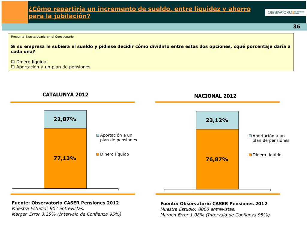 ¿Cómo repartiría un incremento de sueldo, entre liquidez y ahorro para la jubilación? • Pregunta Exacta Usada en el Cuestionario • Si su empresa le subiera el sueldo y pidiese decidir cómo dividirlo entre estas dos opciones, ¿qué porcentaje daría a cada una? • Dinero líquido • Aportación a un plan de pensiones CATALUNYA 2012 NACIONAL 2012 Fuente: Observatorio CASER Pensiones 2012 Muestra Estudio: 907 entrevistas. Margen Error 3.25% (Intervalo de Confianza 95%) Fuente: Observatorio CASER Pensiones 2012 Muestra Estudio: 8000 entrevistas. Margen Error 1,08% (Intervalo de Confianza 95%)