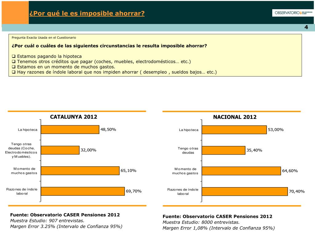 ¿Por qué le es imposible ahorrar? Pregunta Exacta Usada en el Cuestionario ¿Por cuál o cuáles de las siguientes circunstancias le resulta imposible ahorrar? • Estamos pagando la hipoteca • Tenemos otros créditos que pagar (coches, muebles, electrodomésticos… etc.) • Estamos en un momento de muchos gastos. • Hay razones de índole laboral que nos impiden ahorrar ( desempleo , sueldos bajos… etc.) CATALUNYA 2012 NACIONAL 2012 Fuente: Observatorio CASER Pensiones 2012 Muestra Estudio: 907 entrevistas. Margen Error 3.25% (Intervalo de Confianza 95%) Fuente: Observatorio CASER Pensiones 2012 Muestra Estudio: 8000 entrevistas. Margen Error 1,08% (Intervalo de Confianza 95%)