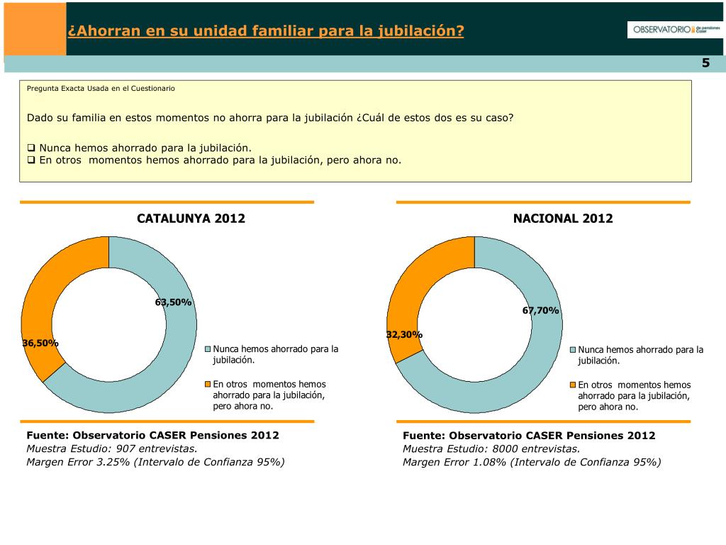 Observatorio Caser Pensiones. CATALUNYA Noviembre 2012. ¿Ahorran en su unidad familiar para la jubilación?. Pregunta Exacta Usada en el Cuestionario ¿Está preparando su familia un ahorro privado para la jubilación? Sí No. Edad media de inicio de ahorro: 35.34 años