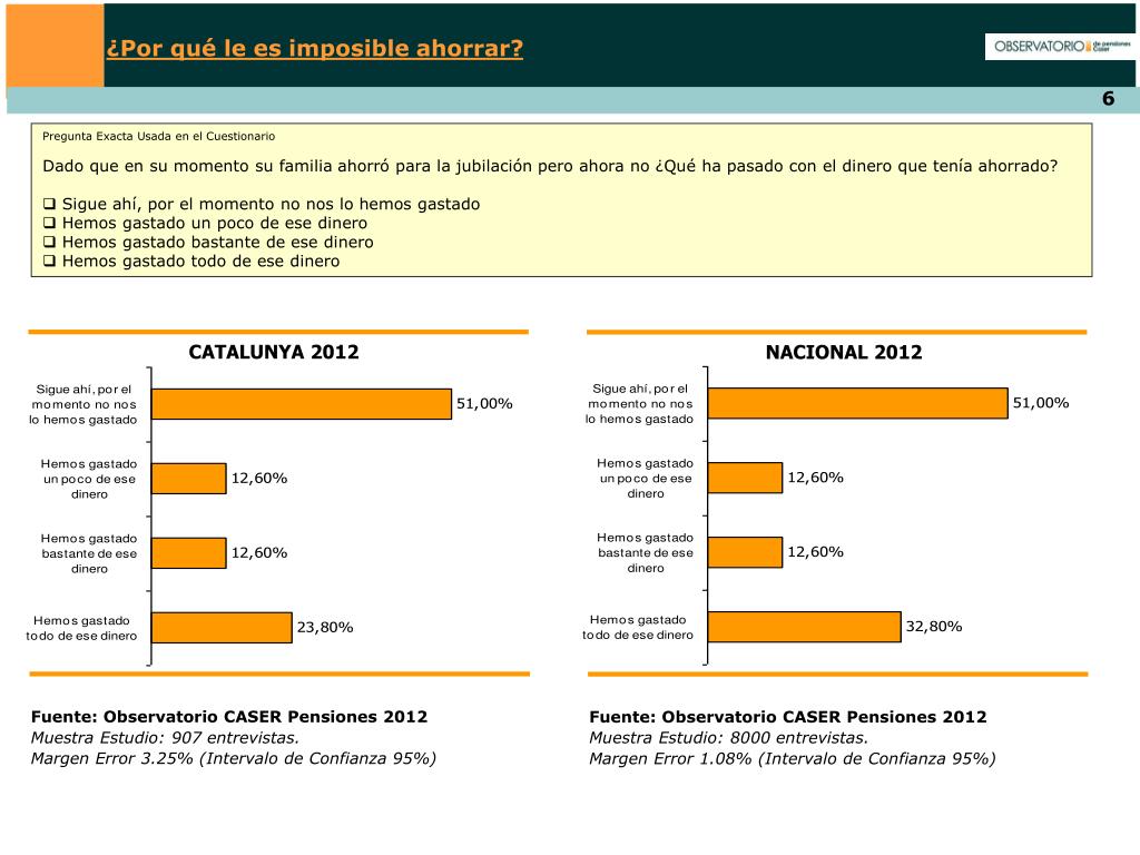 ¿Por qué le es imposible ahorrar? Pregunta Exacta Usada en el Cuestionario Dado que en su momento su familia ahorró para la jubilación pero ahora no ¿Qué ha pasado con el dinero que tenía ahorrado? • Sigue ahí, por el momento no nos lo hemos gastado • Hemos gastado un poco de ese dinero • Hemos gastado bastante de ese dinero • Hemos gastado todo de ese dinero CATALUNYA 2012 NACIONAL 2012 Fuente: Observatorio CASER Pensiones 2012 Muestra Estudio: 907 entrevistas. Margen Error 3.25% (Intervalo de Confianza 95%) Fuente: Observatorio CASER Pensiones 2012 Muestra Estudio: 8000 entrevistas. Margen Error 1.08% (Intervalo de Confianza 95%)