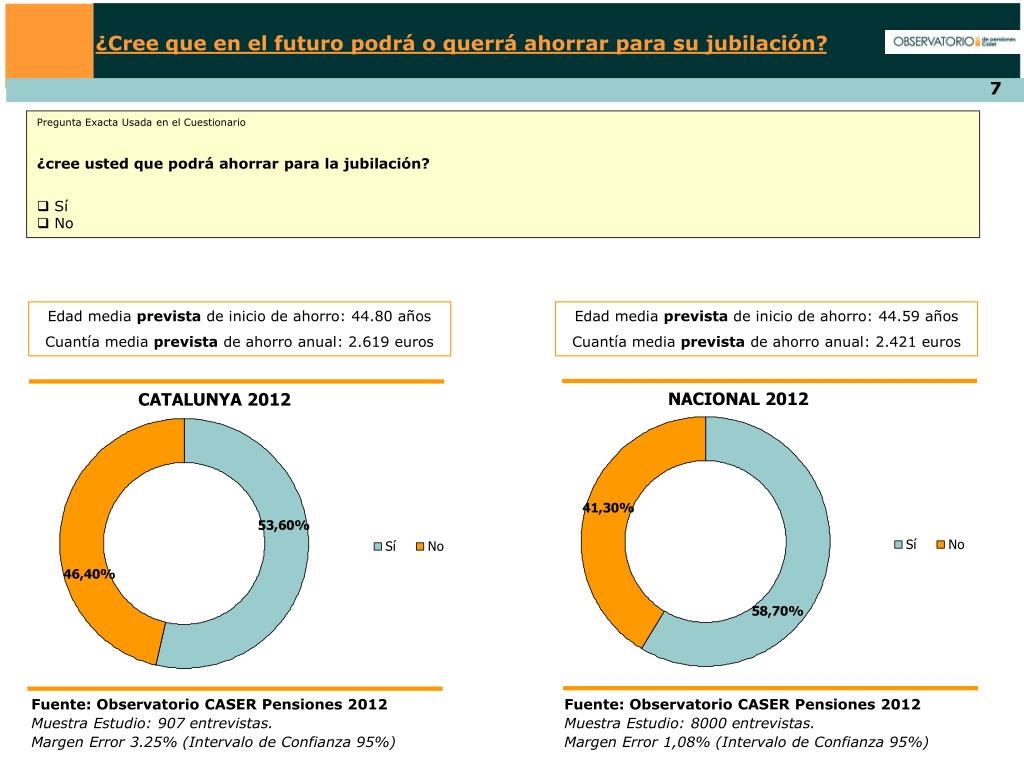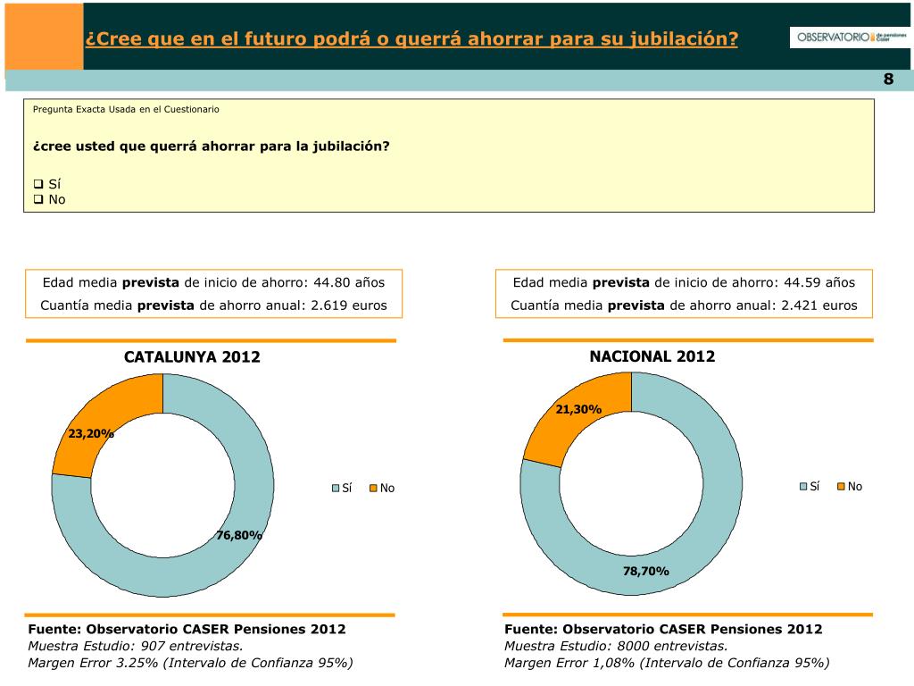 ¿Cree que en el futuro podrá o querrá ahorrar para su jubilación? • Pregunta Exacta Usada en el Cuestionario • ¿cree usted que querrá ahorrar para la jubilación? • Sí • No Edad media prevista de inicio de ahorro: 44.80 años Cuantía media prevista de ahorro anual: 2.619 euros Edad media prevista de inicio de ahorro: 44.59 años Cuantía media prevista de ahorro anual: 2.421 euros NACIONAL 2012 CATALUNYA 2012 Fuente: Observatorio CASER Pensiones 2012 Muestra Estudio: 907 entrevistas. Margen Error 3.25% (Intervalo de Confianza 95%) Fuente: Observatorio CASER Pensiones 2012 Muestra Estudio: 8000 entrevistas. Margen Error 1,08% (Intervalo de Confianza 95%)