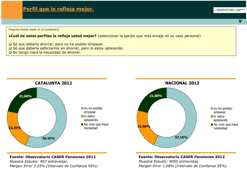 Perfil que le refleja mejor. Pregunta Exacta Usada en el Cuestionario ¿Cuál de estos perfiles le refleja usted mejor? (seleccionar la opción que más encaje en su caso personal) • Sé que debería ahorrar, pero no he podido empezar. • Sé que debería esforzarme en ahorrar, pero lo estoy aplazando. • No tengo clara la necesidad de ahorrar. NACIONAL 2012 CATALUNYA 2012 Fuente: Observatorio CASER Pensiones 2012 Muestra Estudio: 8000 entrevistas. Margen Error 1,08% (Intervalo de Confianza 95%) Fuente: Observatorio CASER Pensiones 2012 Muestra Estudio: 907 entrevistas. Margen Error 3.25% (Intervalo de Confianza 95%)
