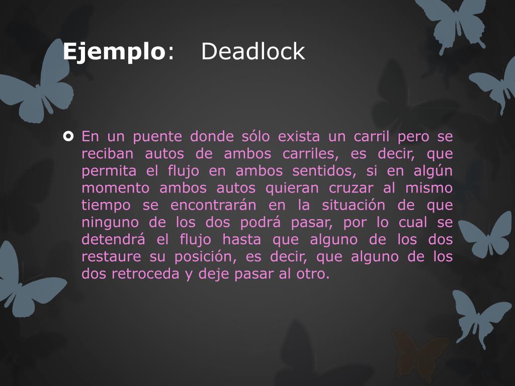 Ejemplo: Deadlock • En un puente donde sólo exista un carril pero se reciban autos de ambos carriles, es decir, que permita el flujo en ambos sentidos, si en algún momento ambos autos quieran cruzar al mismo tiempo se encontrarán en la situación de que ninguno de los dos podrá pasar, por lo cual se detendrá el flujo hasta que alguno de los dos restaure su posición, es decir, que alguno de los dos retroceda y deje pasar al otro.