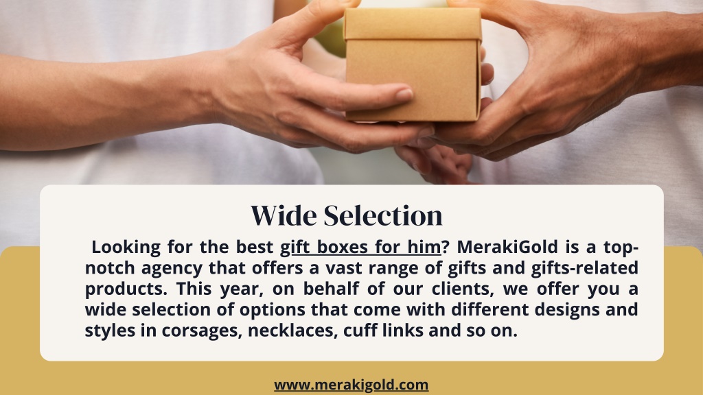 Wide Selection Looking for the best gift boxes for him? MerakiGold is a top- notch agency that offers a vast range of gifts and gifts-related products. This year, on behalf of our clients, we offer you a wide selection of options that come with different designs and styles in corsages, necklaces, cuff links and so on. www.merakigold.com