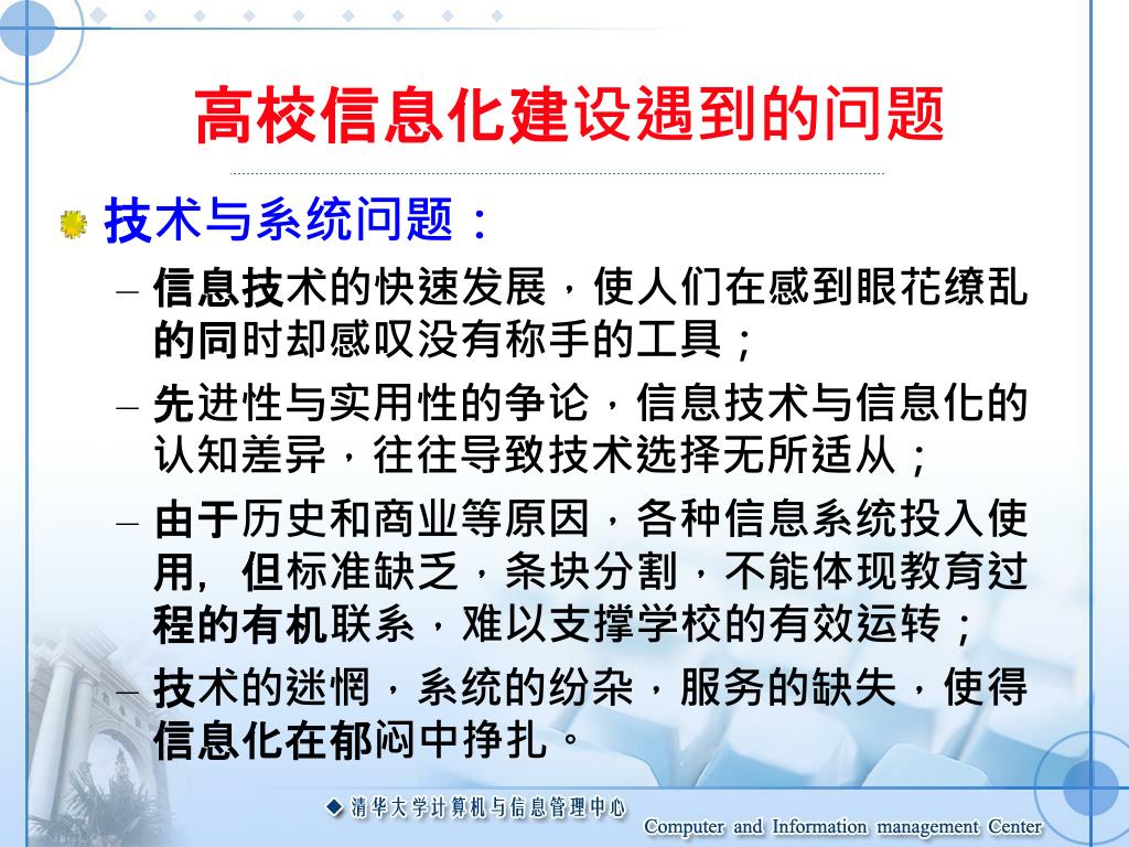高校信息化建设遇到的问题 • 观念与方向问题: • 认为信息化是可选项,是锦上添花,可有可无; • 认为信息化就是购买机器和软件,只要花钱就能解决; • 认为信息化可以一蹴而就,可以突击实现; • 认为信息化是技术人员的事情,管理可以不动; • 找不到信息化的前进方向,没有理论,不做规划,摸着石头过河; • 追逐新技术,热衷新产品,“夏天穿貂皮大衣”。