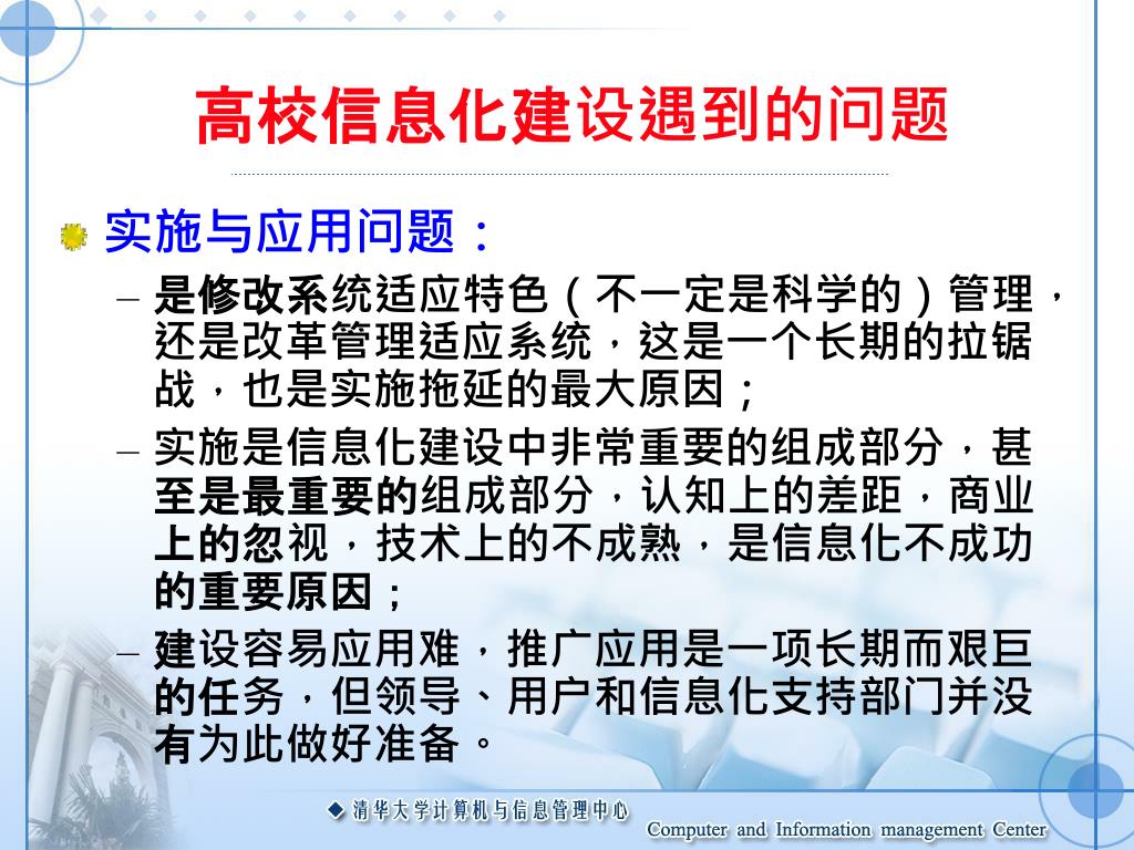 高校信息化建设遇到的问题 • 实施与应用问题: • 是修改系统适应特色(不一定是科学的)管理,还是改革管理适应系统,这是一个长期的拉锯战,也是实施拖延的最大原因; • 实施是信息化建设中非常重要的组成部分,甚至是最重要的组成部分,认知上的差距,商业上的忽视,技术上的不成熟,是信息化不成功的重要原因; • 建设容易应用难,推广应用是一项长期而艰巨的任务,但领导、用户和信息化支持部门并没有为此做好准备。