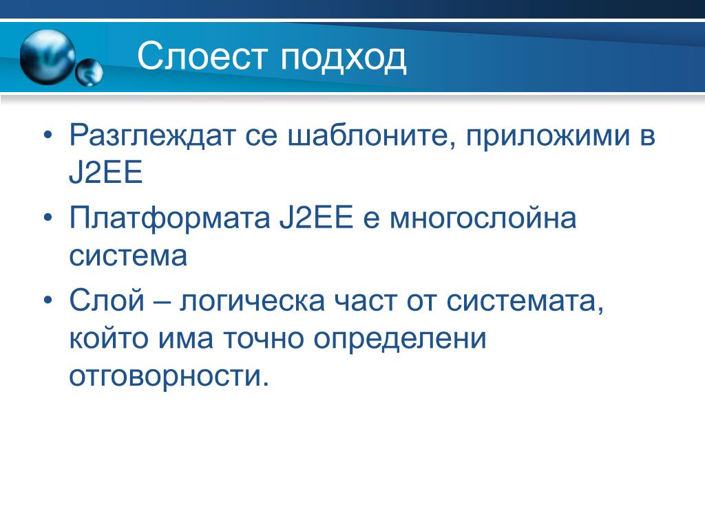 Слоест подход • Разглеждат се шаблоните, приложими в J2EE • Платформата J2EE е многослойна система • Слой – логическа част от системата, който има точно определени отговорности.