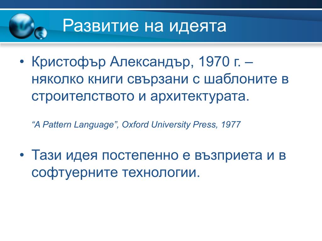 Развитие на идеята • Кристофър Александър, 1970 г. – няколко книги свързани с шаблоните в строителството и архитектурата. “A Pattern Language”, Oxford University Press, 1977 • Тази идея постепенно е възприета и в софтуерните технологии.