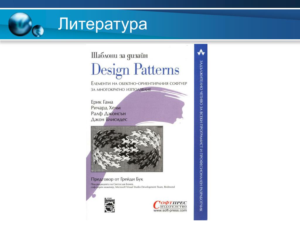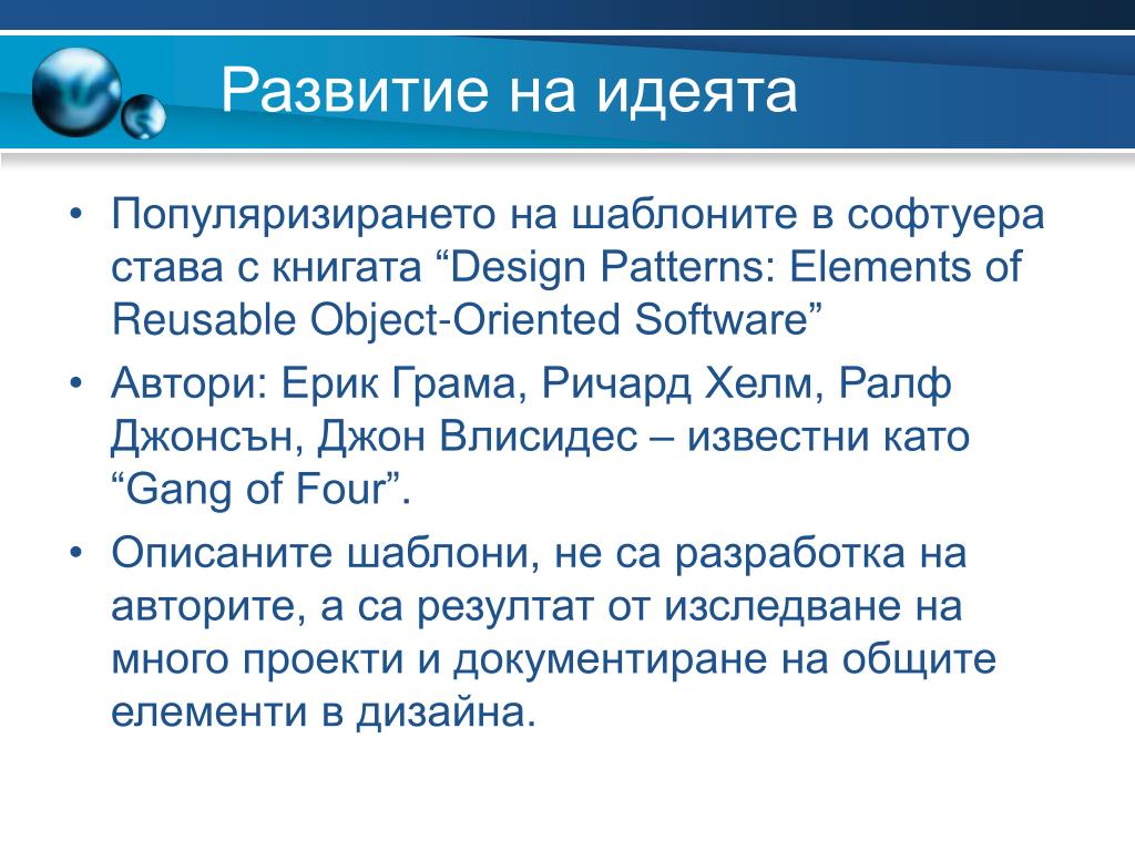 Развитие на идеята • Популяризирането на шаблоните в софтуера става с книгата “Design Patterns: Elements of Reusable Object-Oriented Software” • Автори: Ерик Грама, Ричард Хелм, Ралф Джонсън, Джон Влисидес – известни като “Gang of Four”. • Описаните шаблони, не са разработка на авторите, а са резултат от изследване на много проекти и документиране на общите елементи в дизайна.