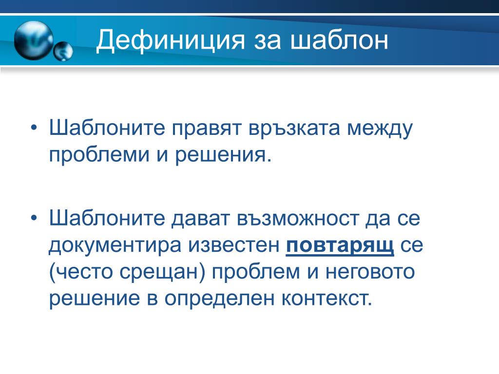 Дефиниция за шаблон Всеки шаблон представлява правило, състоящо се от три части, които дават връзката между някакъв контекст, проблем и решение. --- Кристофър Александър, “A Pattern Language” Всеки шаблон представлява правило, състоящо се от три части, които дават връзката между някакъв контекст, някаква система от условия, които се появяват често в този контекст, и някаква софтуерна конфигурация, която позволява тези условия да бъдат изпълнени. --- Ричард Гейбриъл Шаблонът е идея, която е била полезна в един конкретен контекст и вероятно може да бъде използвана и в други. --- Мартин Флауър, “Analisys Patterns”