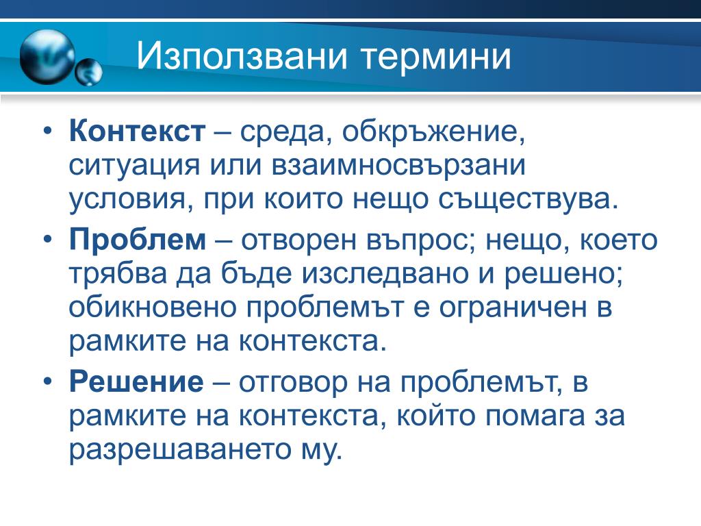 Използвани термини • Контекст – среда, обкръжение, ситуация или взаимносвързани условия, при които нещо съществува. • Проблем – отворен въпрос; нещо, което трябва да бъде изследвано и решено; обикновено проблемът е ограничен в рамките на контекста. • Решение – отговор на проблемът, в рамките на контекста, който помага за разрешаването му.