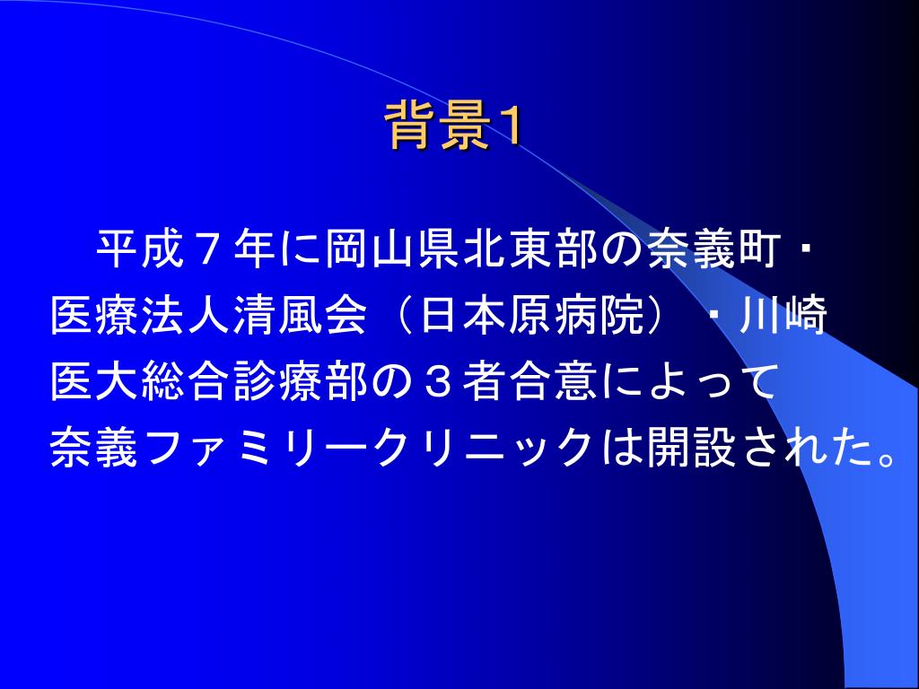 背景1 平成7年に岡山県北東部の奈義町・ 医療法人清風会(日本原病院)・川崎 医大総合診療部の3者合意によって 奈義ファミリークリニックは開設された。