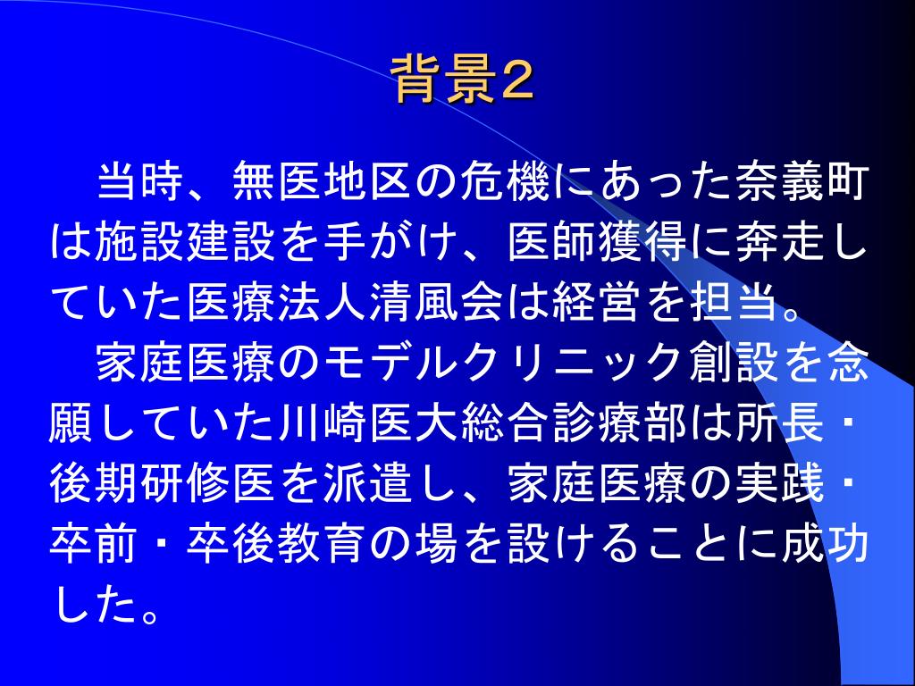 背景2 当時、無医地区の危機にあった奈義町 は施設建設を手がけ、医師獲得に奔走し ていた医療法人清風会は経営を担当。 家庭医療のモデルクリニック創設を念 願していた川崎医大総合診療部は所長・ 後期研修医を派遣し、家庭医療の実践・ 卒前・卒後教育の場を設けることに成功 した。