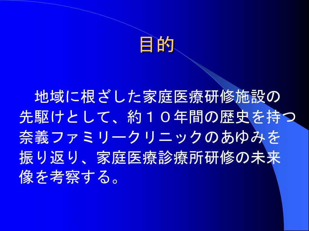 目的 地域に根ざした家庭医療研修施設の 先駆けとして、約10年間の歴史を持つ 奈義ファミリークリニックのあゆみを 振り返り、家庭医療診療所研修の未来 像を考察する。
