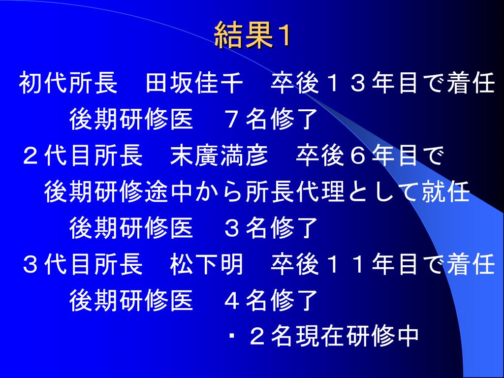 結果1 初代所長 田坂佳千 卒後13年目で着任 後期研修医 7名修了 2代目所長 末廣満彦 卒後6年目で 後期研修途中から所長代理として就任 後期研修医 3名修了 3代目所長 松下明 卒後11年目で着任 後期研修医 4名修了 ・2名現在研修中
