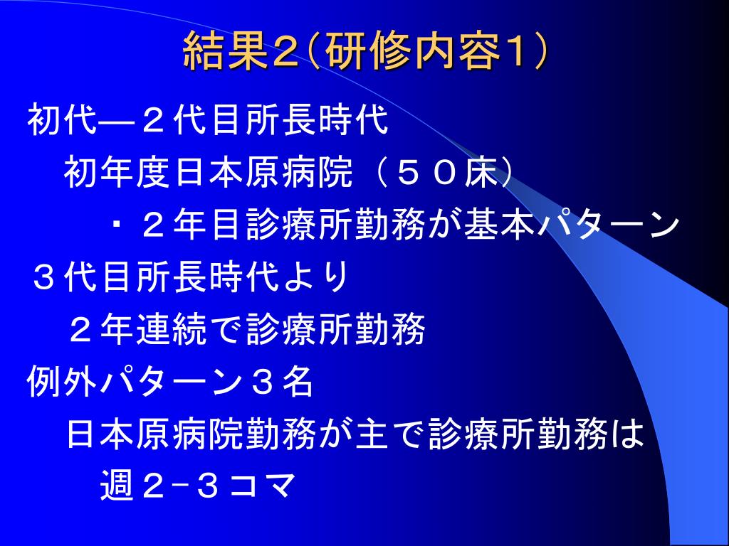 結果2(研修内容1) 初代―2代目所長時代 初年度日本原病院(50床) ・2年目診療所勤務が基本パターン 3代目所長時代より 2年連続で診療所勤務 例外パターン3名 日本原病院勤務が主で診療所勤務は 週2-3コマ