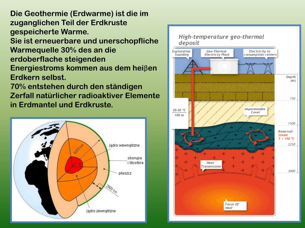 Die Geothermie (Erdwarme) ist die im zuganglichen Teil der Erdkruste gespeicherte Warme. Sie ist erneuerbare und unerschopfliche Warmequelle 30% des an die erdoberflache steigenden Energiestroms kommen aus dem heiβen Erdkern selbst. 70% entstehen durch den ständigen Zerfall natürlicher radioaktiver Elemente in Erdmantel und Erdkruste.