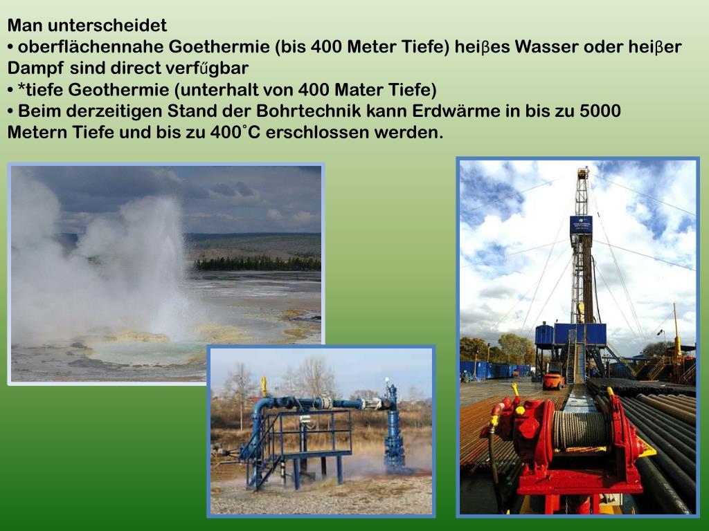 Man unterscheidet • oberflächennahe Goethermie (bis 400 Meter Tiefe) heiβes Wasser oder heiβer Dampf sind direct verfűgbar • *tiefe Geothermie (unterhalt von 400 Mater Tiefe) • Beim derzeitigen Stand der Bohrtechnik kann Erdwärme in bis zu 5000 Metern Tiefe und bis zu 400˚C erschlossen werden.
