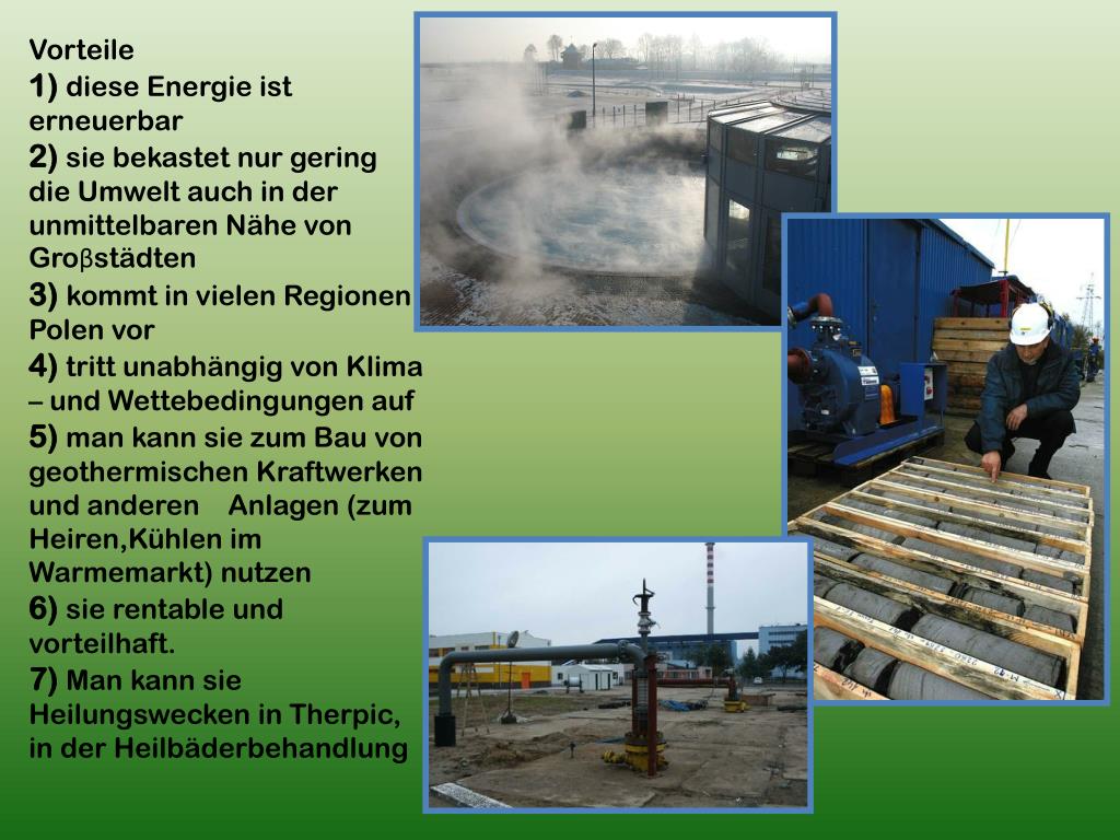 Vorteile 1) diese Energie ist erneuerbar 2) sie bekastet nur gering die Umwelt auch in der unmittelbaren Nähe von Groβstädten 3) kommt in vielen Regionen Polen vor 4) tritt unabhängig von Klima – und Wettebedingungen auf 5) man kann sie zum Bau von geothermischen Kraftwerken und anderen Anlagen (zum Heiren,Kühlen im Warmemarkt) nutzen 6) sie rentable und vorteilhaft. 7) Man kann sie Heilungswecken in Therpic, in der Heilbäderbehandlung