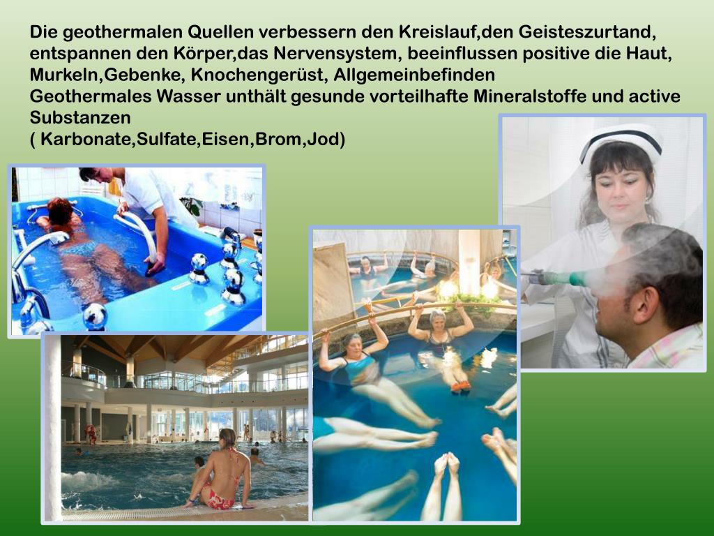 Die geothermalen Quellen verbessern den Kreislauf,den Geisteszurtand, entspannen den Körper,das Nervensystem, beeinflussen positive die Haut, Murkeln,Gebenke, Knochengerüst, Allgemeinbefinden Geothermales Wasser unthält gesunde vorteilhafte Mineralstoffe und active Substanzen ( Karbonate,Sulfate,Eisen,Brom,Jod)