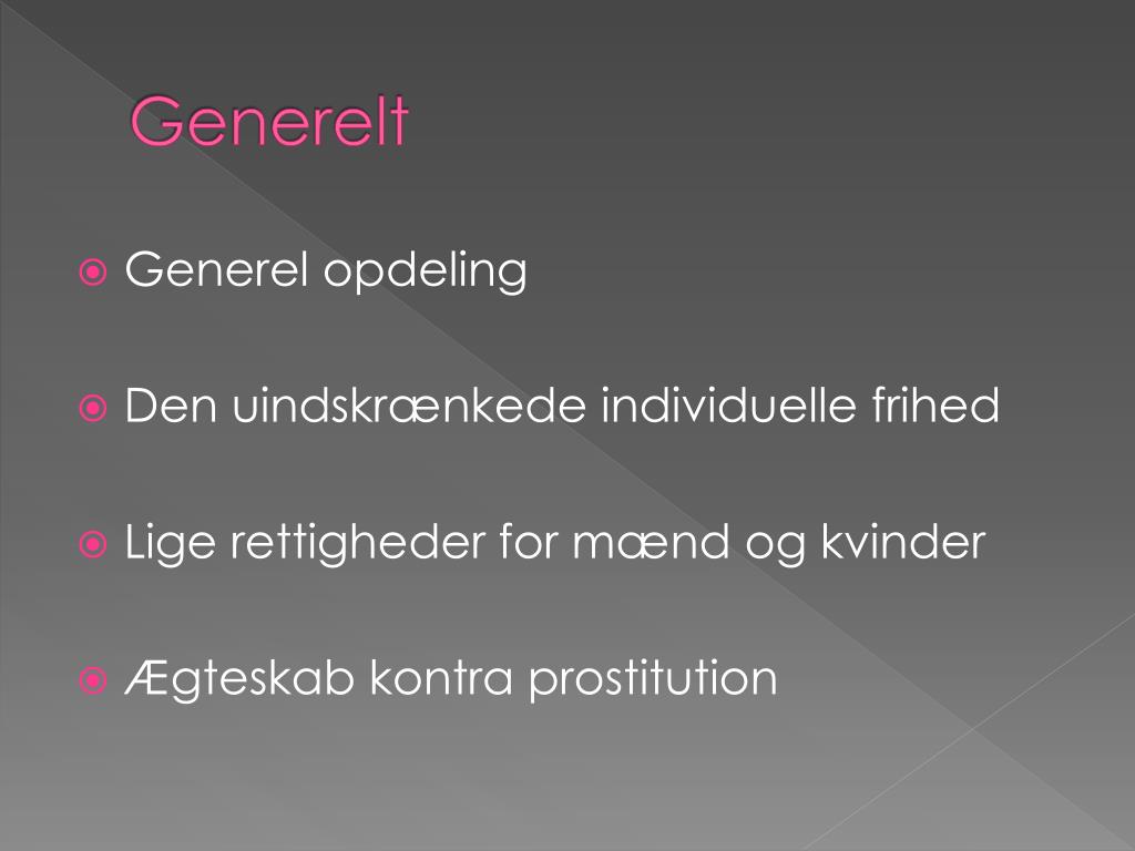Generelt • Generel opdeling • Den uindskrænkede individuelle frihed • Lige rettigheder for mænd og kvinder • Ægteskab kontra prostitution