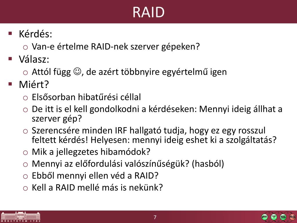 RAID • Kérdés: • Van-e értelme RAID-nek szerver gépeken? • Válasz: • Attól függ , de azért többnyire egyértelmű igen • Miért? • Elsősorban hibatűrési céllal • De itt is el kell gondolkodni a kérdéseken: Mennyi ideig állhat a szerver gép? • Szerencsére minden IRF hallgató tudja, hogy ez egy rosszul feltett kérdés! Helyesen: mennyi ideig eshet ki a szolgáltatás? • Mik a jellegzetes hibamódok? • Mennyi az előfordulási valószínűségük? (hasból) • Ebből mennyi ellen véd a RAID? • Kell a RAID mellé más is nekünk?