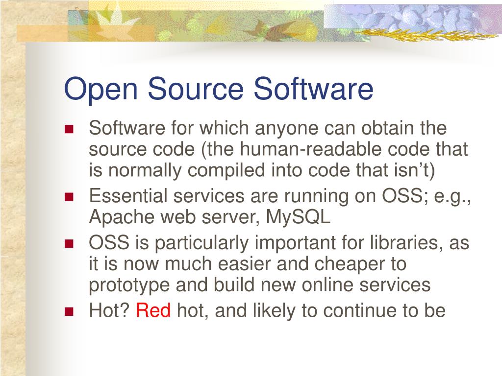 Open Source Software • Software for which anyone can obtain the source code (the human-readable code that is normally compiled into code that isn’t) • Essential services are running on OSS; e.g., Apache web server, MySQL • OSS is particularly important for libraries, as it is now much easier and cheaper to prototype and build new online services • Hot? Red hot, and likely to continue to be