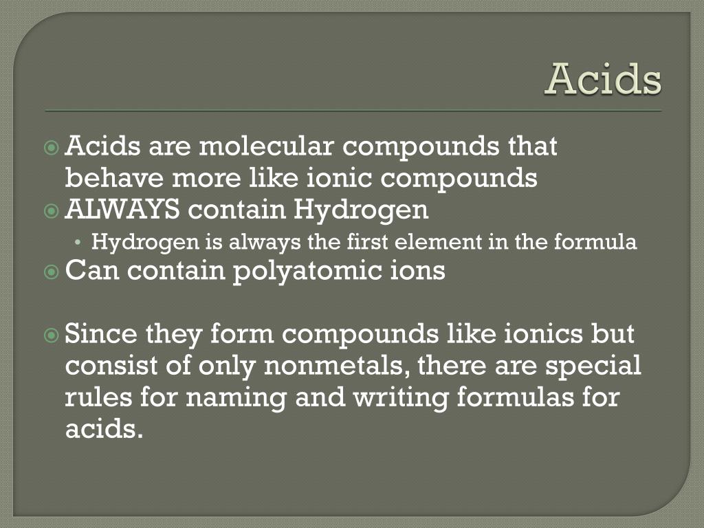 Acids • Acids are molecular compounds that behave more like ionic compounds • ALWAYS contain Hydrogen • Hydrogen is always the first element in the formula • Can contain polyatomic ions • Since they form compounds like ionics but consist of only nonmetals, there are special rules for naming and writing formulas for acids.