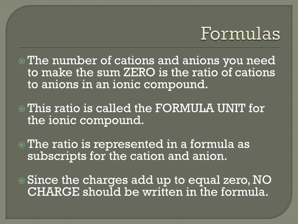 Formulas The number of cations and anions you need to make the sum ZERO is the ratio of cations to anions in an ionic compound. This ratio is called the FORMULA UNIT for the ionic compound. The ratio is represented in a formula as subscripts for the cation and anion. Since the charges add up to equal zero, NO CHARGE should be written in the formula.