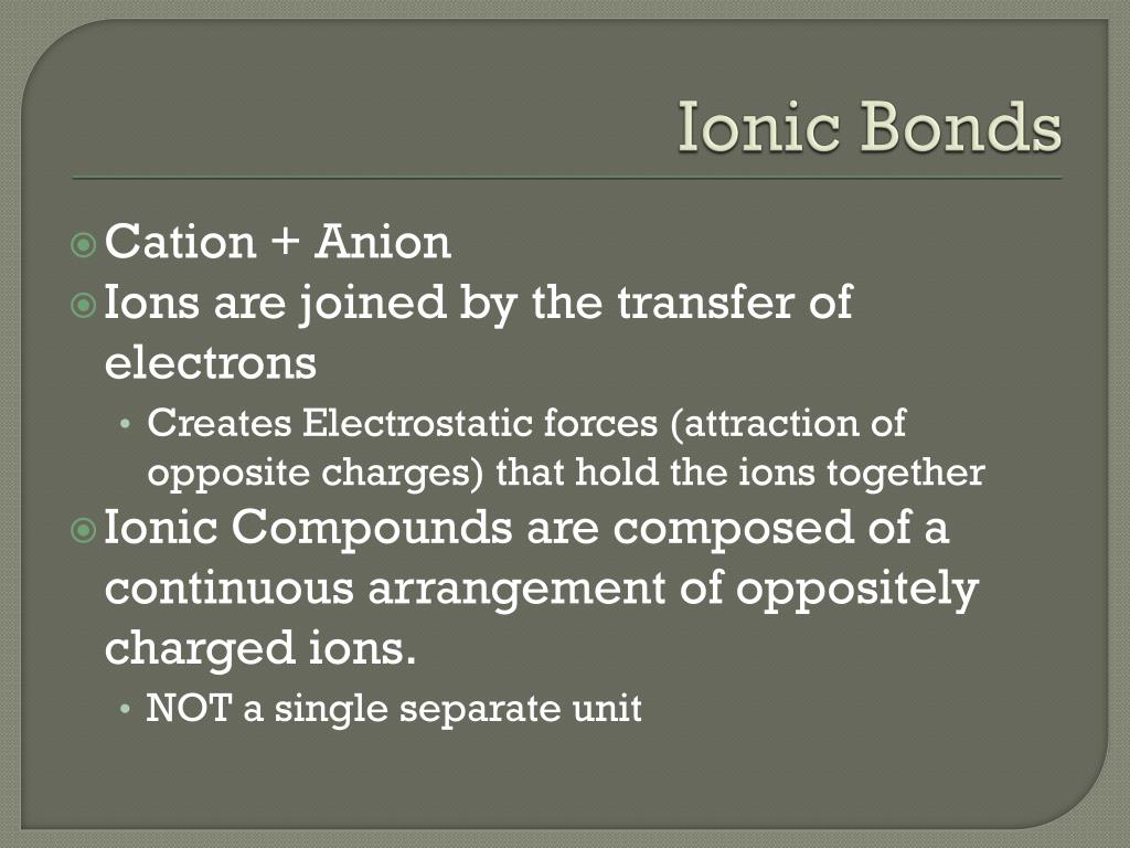 Ionic Bonds • Cation + Anion • Ions are joined by the transfer of electrons • Creates Electrostatic forces (attraction of opposite charges) that hold the ions together • Ionic Compounds are composed of a continuous arrangement of oppositely charged ions. • NOT a single separate unit