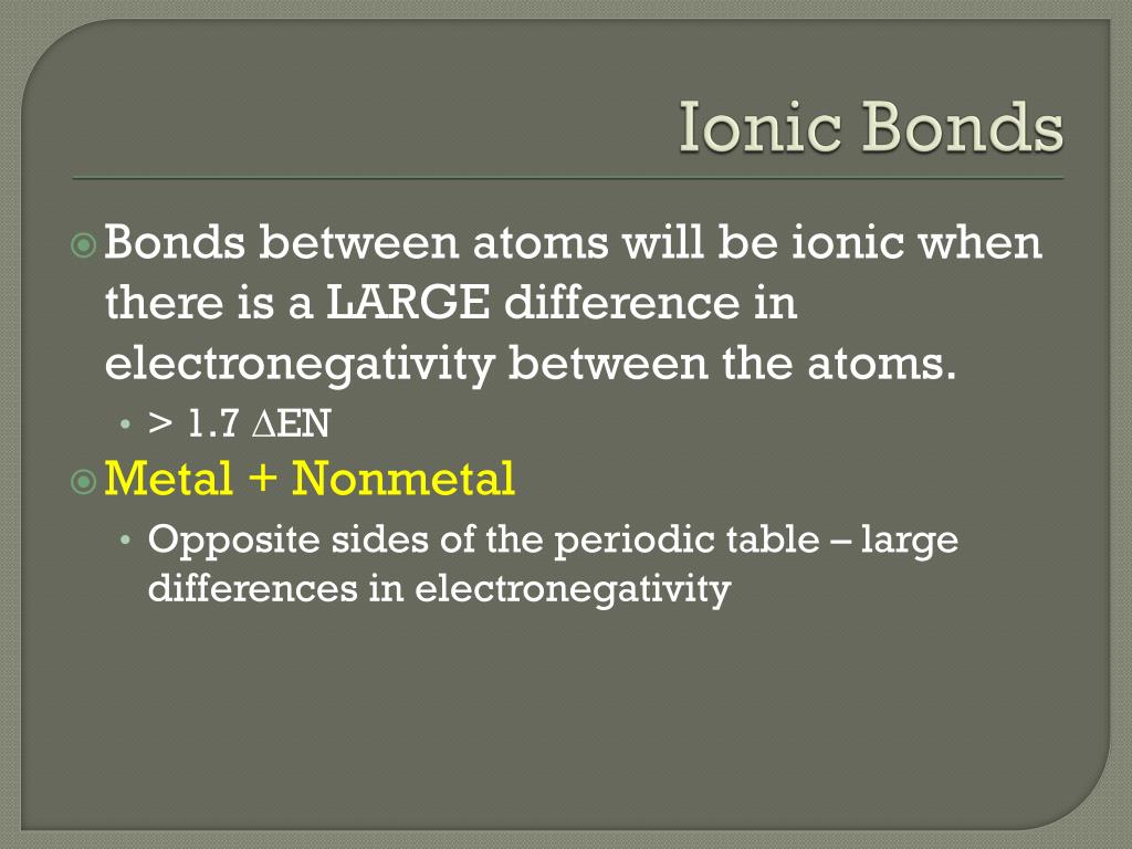 Ionic Bonds • Bonds between atoms will be ionic when there is a LARGE difference in electronegativity between the atoms. • > 1.7 ∆EN • Metal + Nonmetal • Opposite sides of the periodic table – large differences in electronegativity