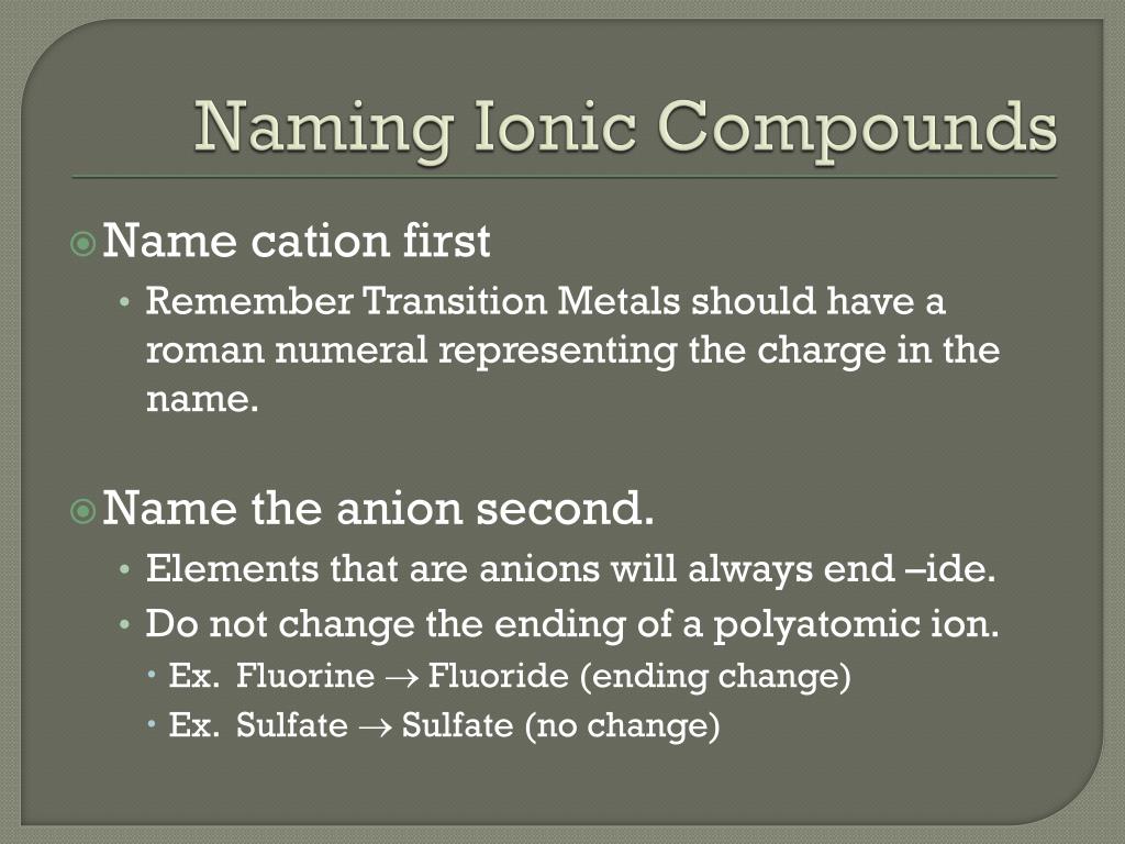 Naming Ionic Compounds • Name cation first • Remember Transition Metals should have a roman numeral representing the charge in the name. • Name the anion second. • Elements that are anions will always end –ide. • Do not change the ending of a polyatomic ion. • Ex. Fluorine Fluoride (ending change) • Ex. Sulfate Sulfate (no change)