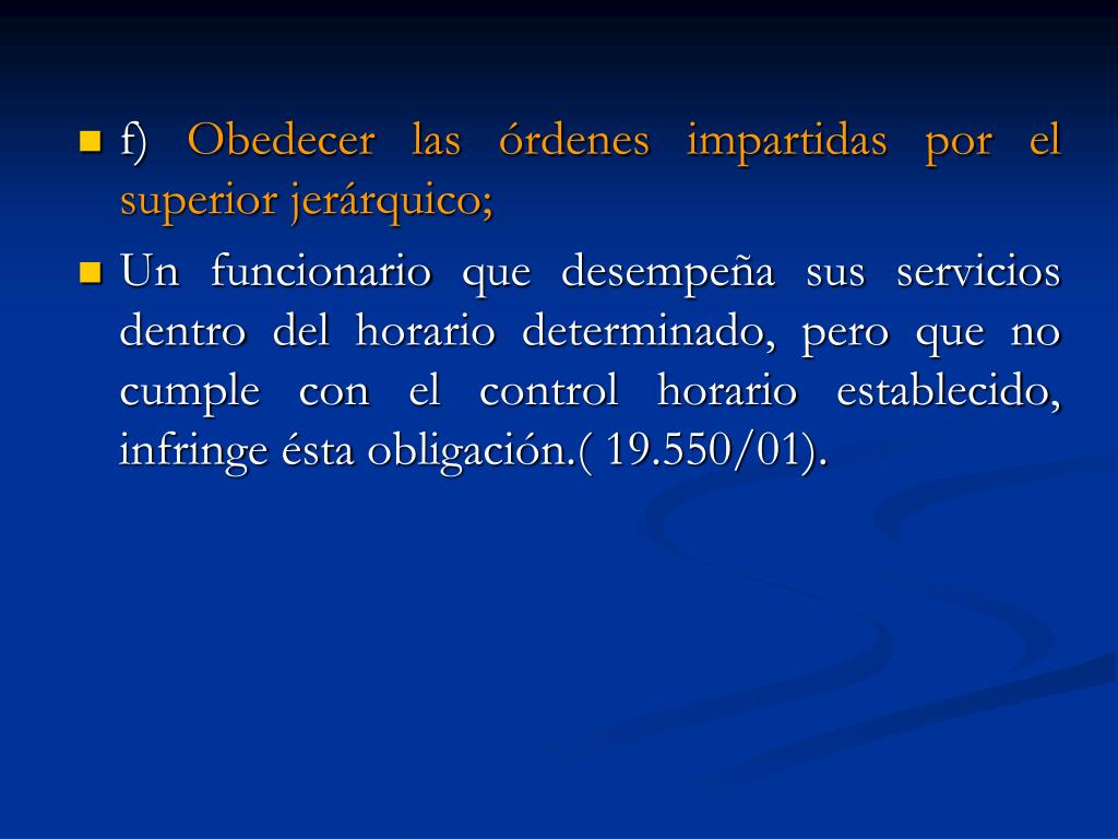 f) Obedecer las órdenes impartidas por el superior jerárquico; • Un funcionario que desempeña sus servicios dentro del horario determinado, pero que no cumple con el control horario establecido, infringe ésta obligación.( 19.550/01).