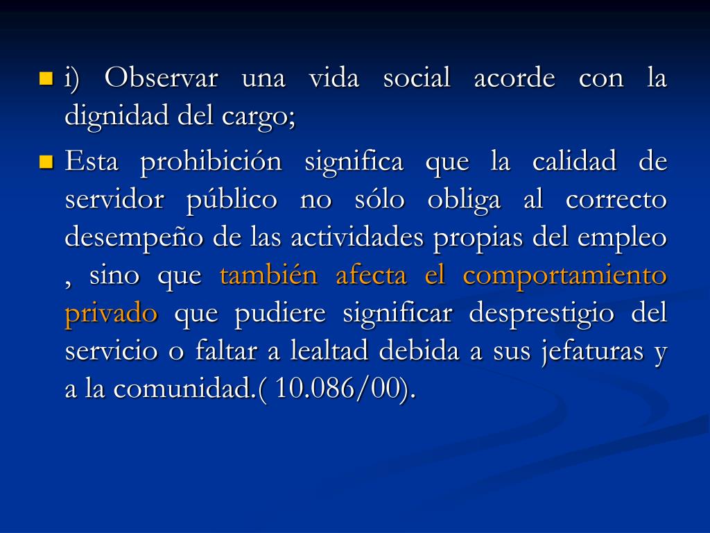 i) Observar una vida social acorde con la dignidad del cargo; • Esta prohibición significa que la calidad de servidor público no sólo obliga al correcto desempeño de las actividades propias del empleo , sino que también afecta el comportamiento privado que pudiere significar desprestigio del servicio o faltar a lealtad debida a sus jefaturas y a la comunidad.( 10.086/00).