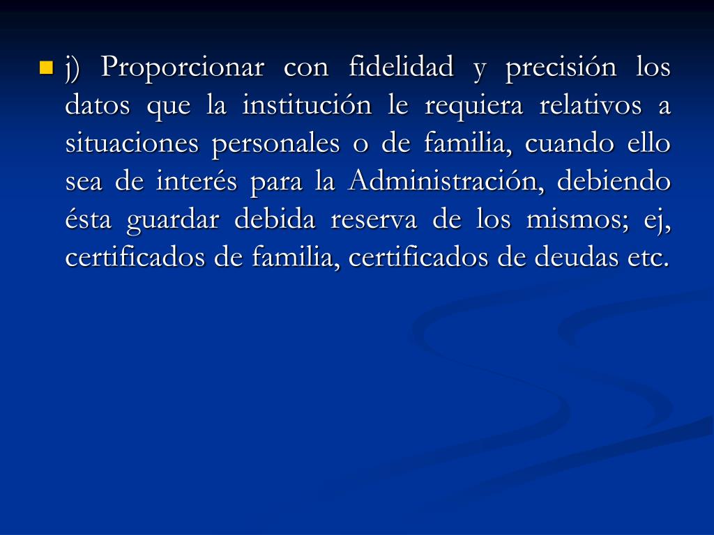 j) Proporcionar con fidelidad y precisión los datos que la institución le requiera relativos a situaciones personales o de familia, cuando ello sea de interés para la Administración, debiendo ésta guardar debida reserva de los mismos; ej, certificados de familia, certificados de deudas etc.