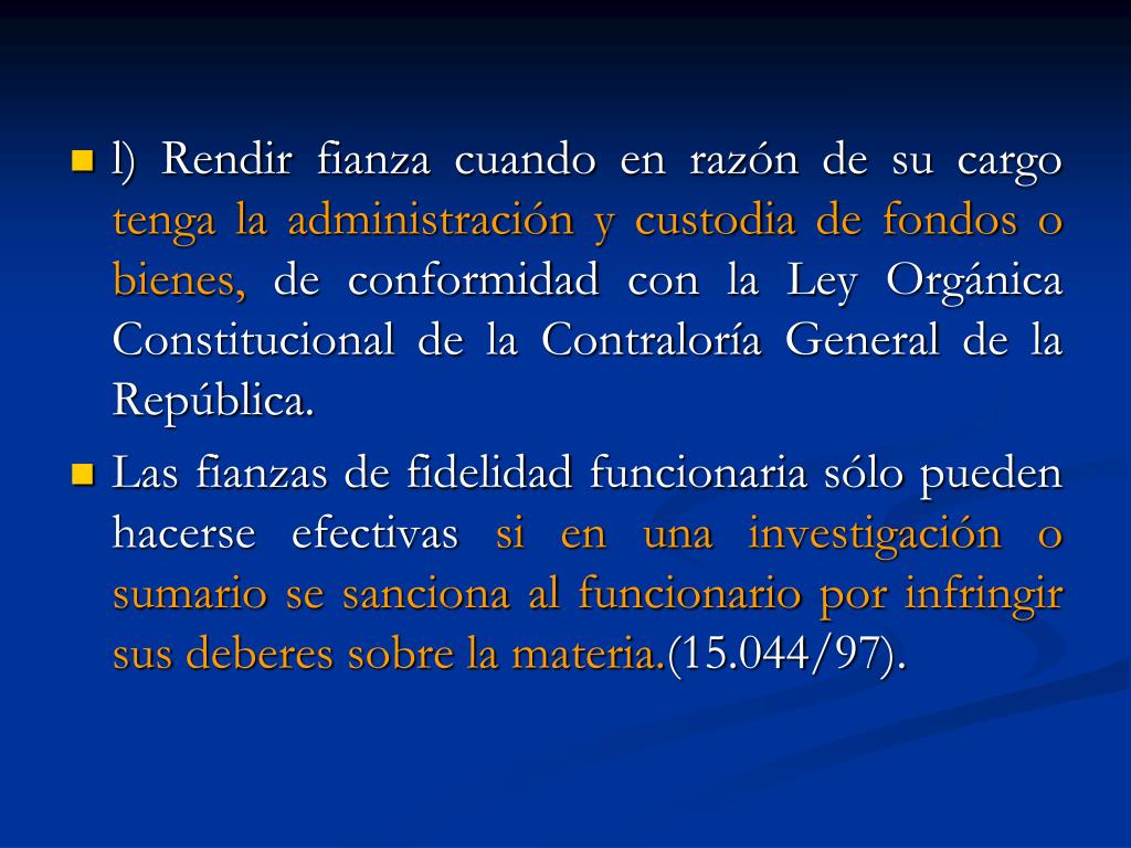 l) Rendir fianza cuando en razón de su cargo tenga la administración y custodia de fondos o bienes, de conformidad con la Ley Orgánica Constitucional de la Contraloría General de la República. • Las fianzas de fidelidad funcionaria sólo pueden hacerse efectivas si en una investigación o sumario se sanciona al funcionario por infringir sus deberes sobre la materia.(15.044/97).