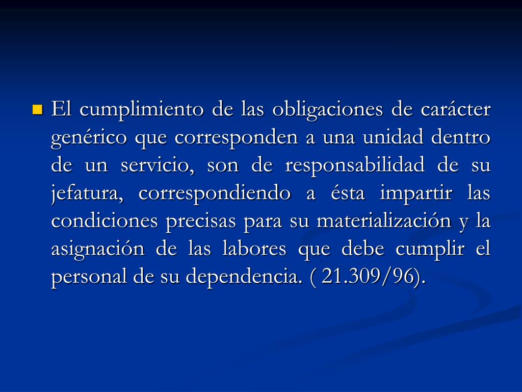 El cumplimiento de las obligaciones de carácter genérico que corresponden a una unidad dentro de un servicio, son de responsabilidad de su jefatura, correspondiendo a ésta impartir las condiciones precisas para su materialización y la asignación de las labores que debe cumplir el personal de su dependencia. ( 21.309/96).