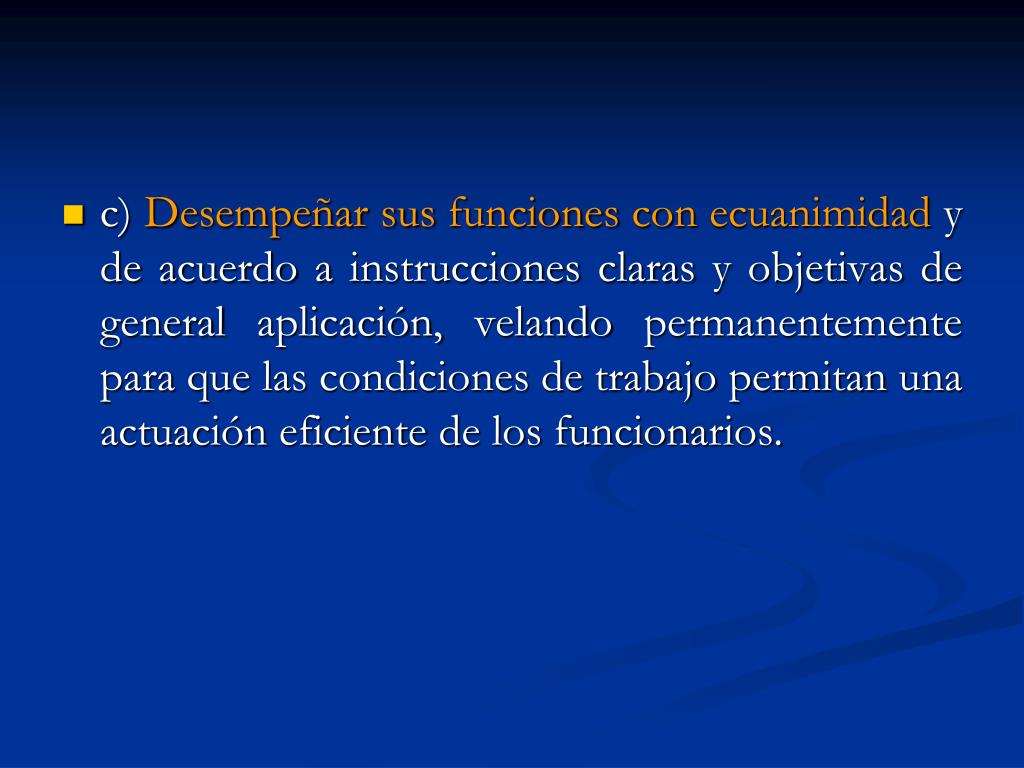c) Desempeñar sus funciones con ecuanimidad y de acuerdo a instrucciones claras y objetivas de general aplicación, velando permanentemente para que las condiciones de trabajo permitan una actuación eficiente de los funcionarios.