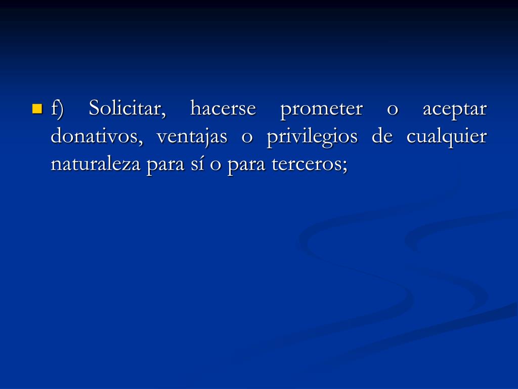 f) Solicitar, hacerse prometer o aceptar donativos, ventajas o privilegios de cualquier naturaleza para sí o para terceros;