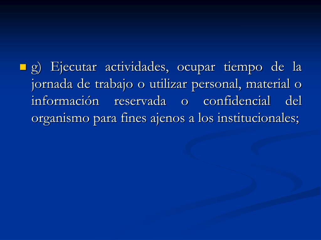 g) Ejecutar actividades, ocupar tiempo de la jornada de trabajo o utilizar personal, material o información reservada o confidencial del organismo para fines ajenos a los institucionales;
