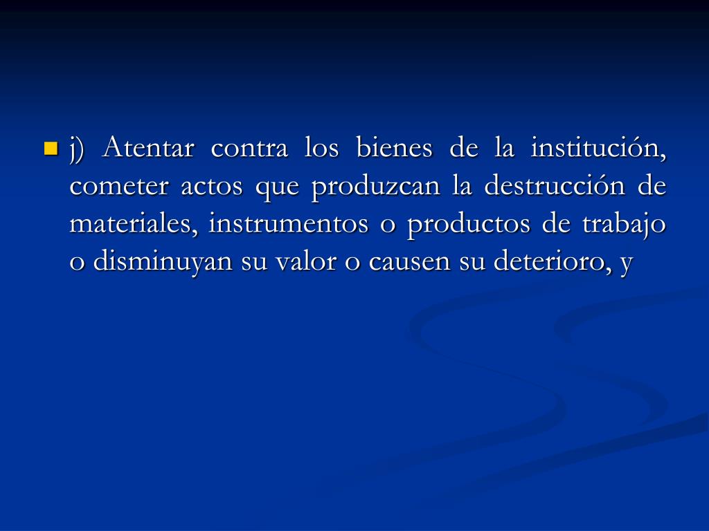 j) Atentar contra los bienes de la institución, cometer actos que produzcan la destrucción de materiales, instrumentos o productos de trabajo o disminuyan su valor o causen su deterioro, y