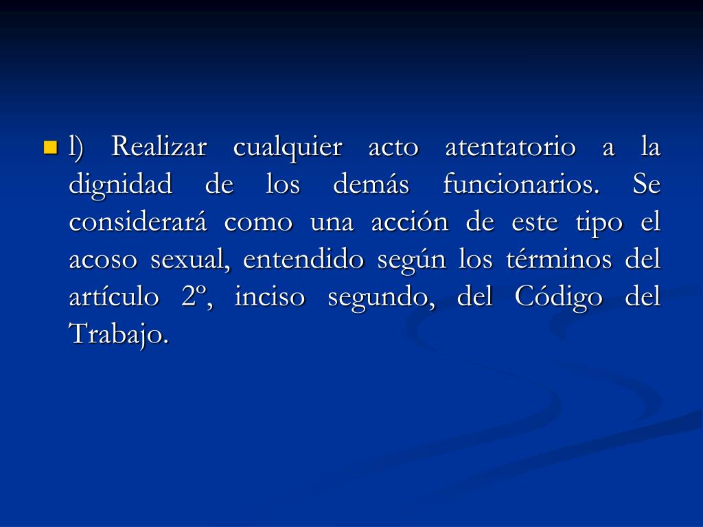l) Realizar cualquier acto atentatorio a la dignidad de los demás funcionarios. Se considerará como una acción de este tipo el acoso sexual, entendido según los términos del artículo 2º, inciso segundo, del Código del Trabajo.
