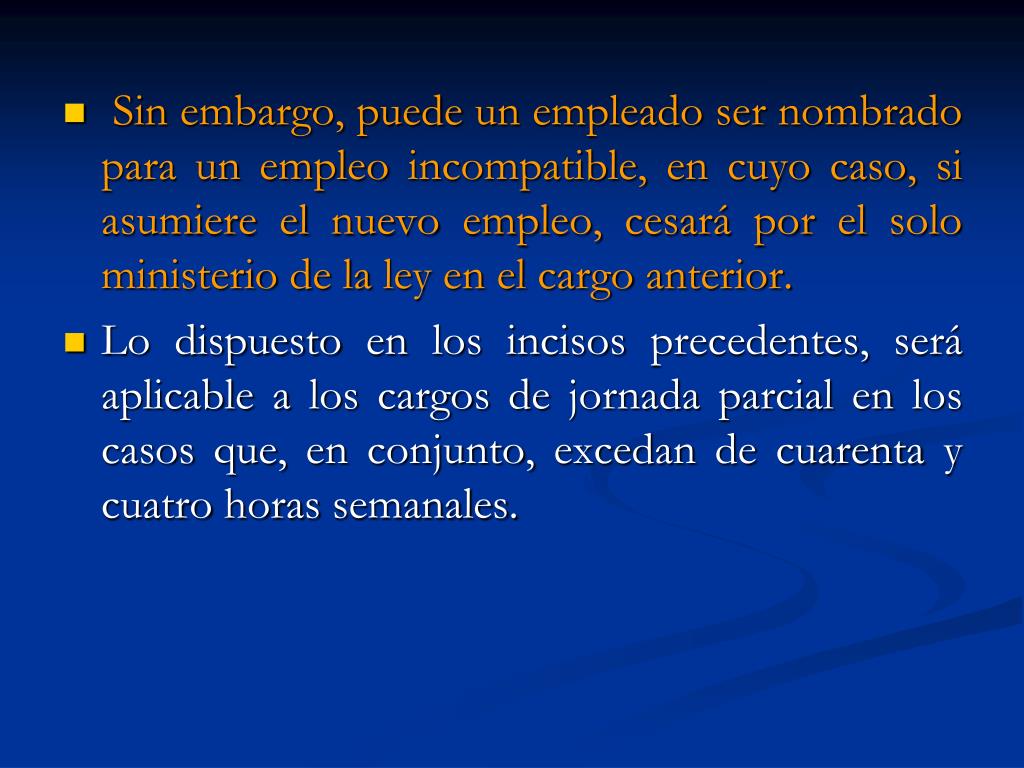 Sin embargo, puede un empleado ser nombrado para un empleo incompatible, en cuyo caso, si asumiere el nuevo empleo, cesará por el solo ministerio de la ley en el cargo anterior. • Lo dispuesto en los incisos precedentes, será aplicable a los cargos de jornada parcial en los casos que, en conjunto, excedan de cuarenta y cuatro horas semanales.