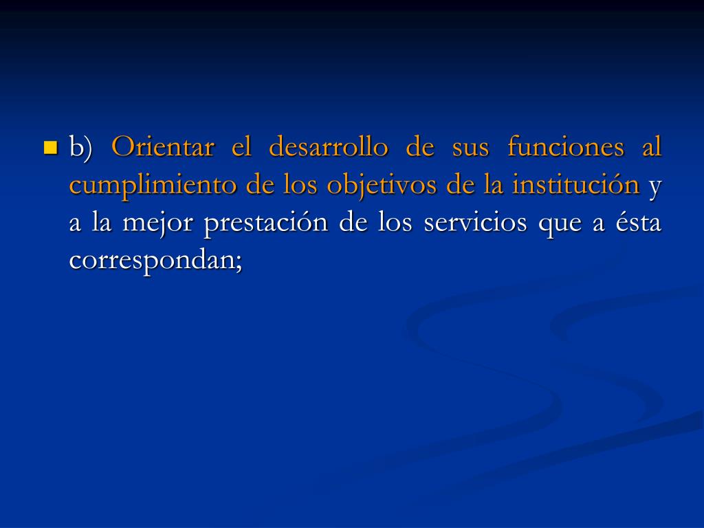 b) Orientar el desarrollo de sus funciones al cumplimiento de los objetivos de la institución y a la mejor prestación de los servicios que a ésta correspondan;