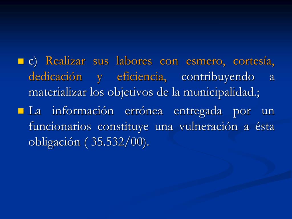 c) Realizar sus labores con esmero, cortesía, dedicación y eficiencia, contribuyendo a materializar los objetivos de la municipalidad.; • La información errónea entregada por un funcionarios constituye una vulneración a ésta obligación ( 35.532/00).