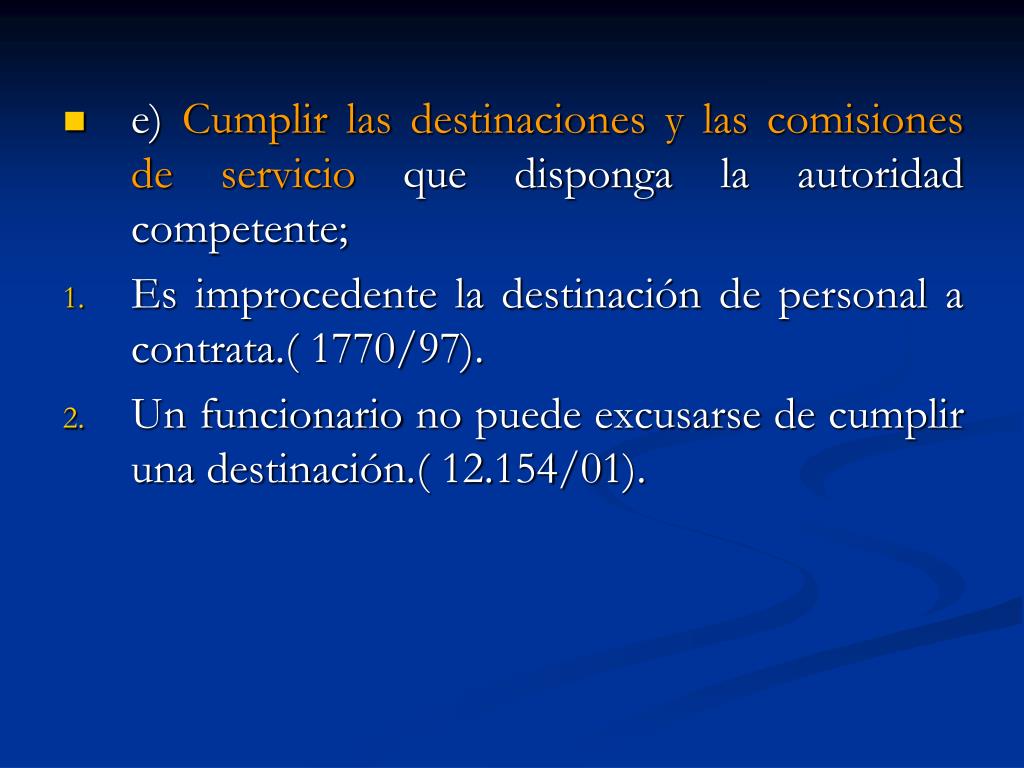 e) Cumplir las destinaciones y las comisiones de servicio que disponga la autoridad competente; • Es improcedente la destinación de personal a contrata.( 1770/97). • Un funcionario no puede excusarse de cumplir una destinación.( 12.154/01).