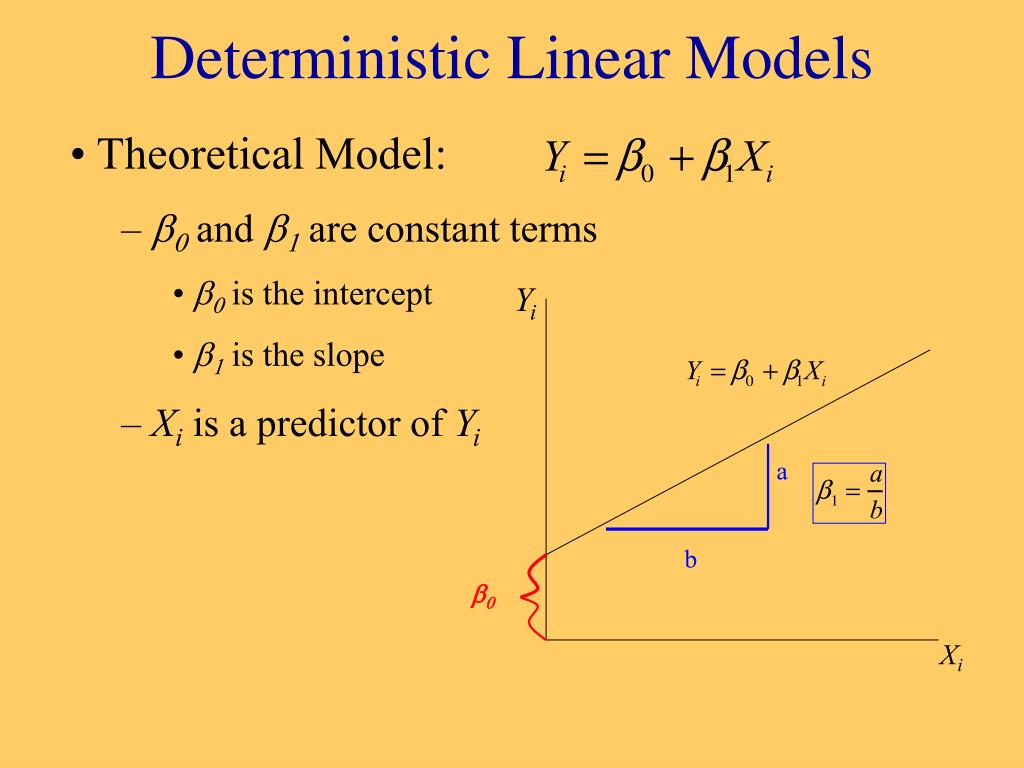 a b • Theoretical Model: • b0andb1are constant terms • b0 is the intercept • b1 is the slope • Xi is a predictor of Yi Deterministic Linear Models Yi b0 Xi