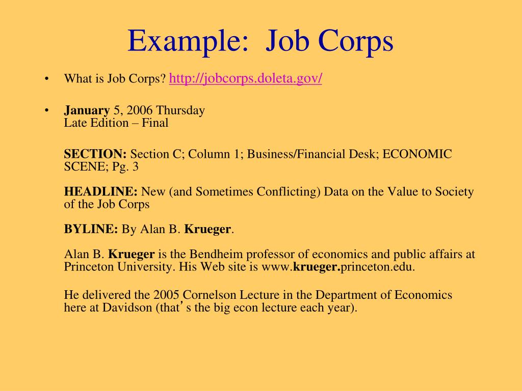 Example: Job Corps • What is Job Corps? http://jobcorps.doleta.gov/ • January 5, 2006 Thursday Late Edition – Final SECTION: Section C; Column 1; Business/Financial Desk; ECONOMIC SCENE; Pg. 3HEADLINE: New (and Sometimes Conflicting) Data on the Value to Society of the Job CorpsBYLINE: By Alan B. Krueger. Alan B. Krueger is the Bendheim professor of economics and public affairs at Princeton University. His Web site is www.krueger.princeton.edu. He delivered the 2005 Cornelson Lecture in the Department of Economics here at Davidson (that’s the big econ lecture each year).