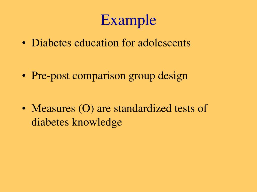 Example • Diabetes education for adolescents • Pre-post comparison group design • Measures (O) are standardized tests of diabetes knowledge